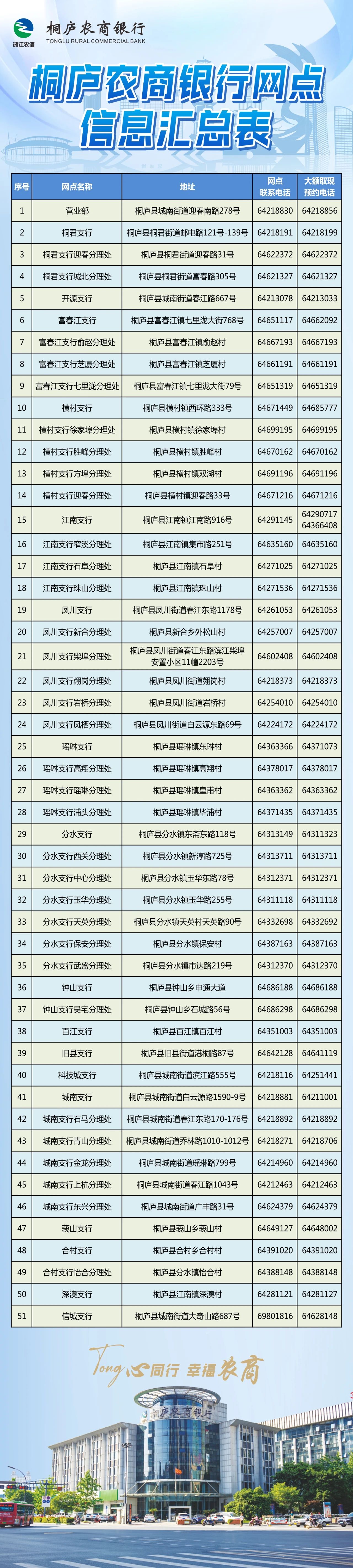 1 | 信城支行 | 5060活动中心 | 桐庐县大奇山路687号 | 69801816 | 周一至周日,8:00-17:00 (节假日休息) |