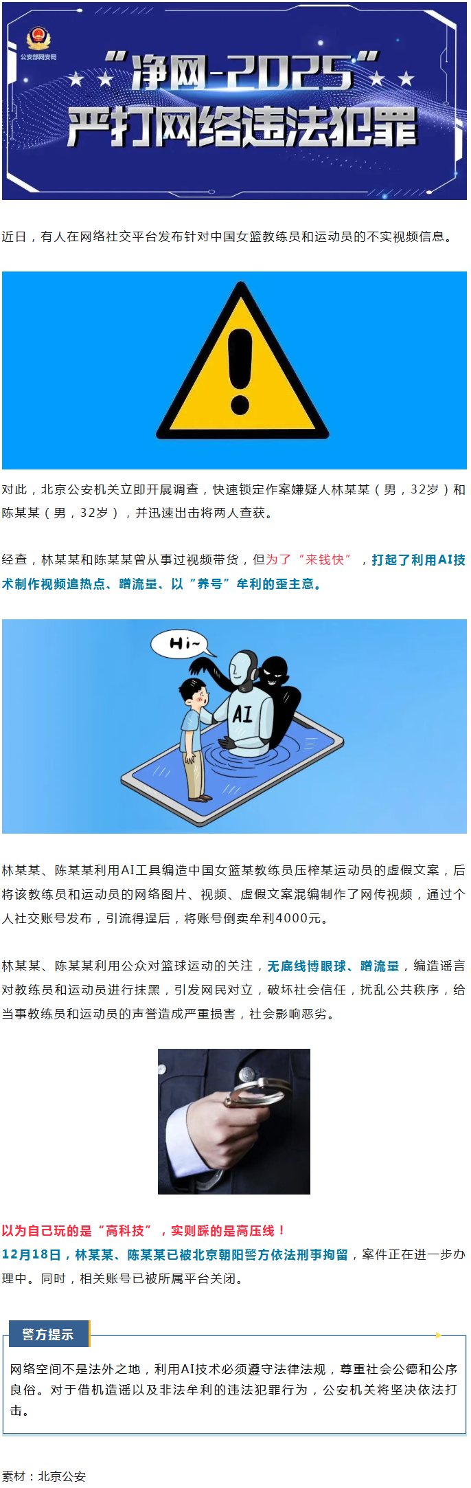 利用AI造谣“中国女篮”,两男子被北京公安机关刑拘
